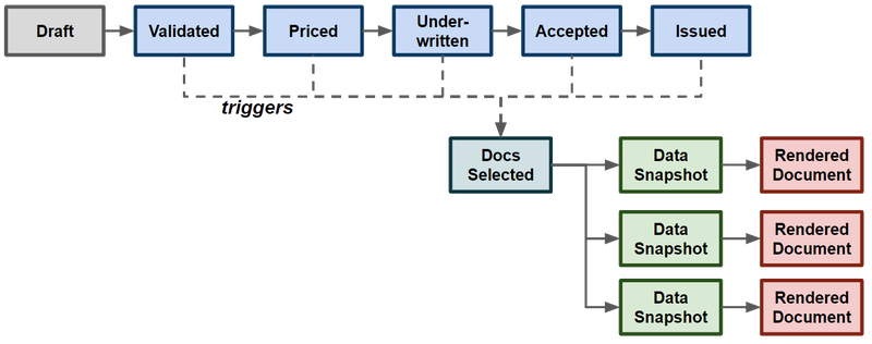 Tenants may be configured so that when a quote or policy transaction reaches any or all of the validated, priced, underwritten, accepted, or issued states, documents are created based on the state of the data for the quote or transaction at that time. These state transitions are called “triggers” for documents. Each document type configured is based on one of these triggers, and each product can have a different set of documents created.